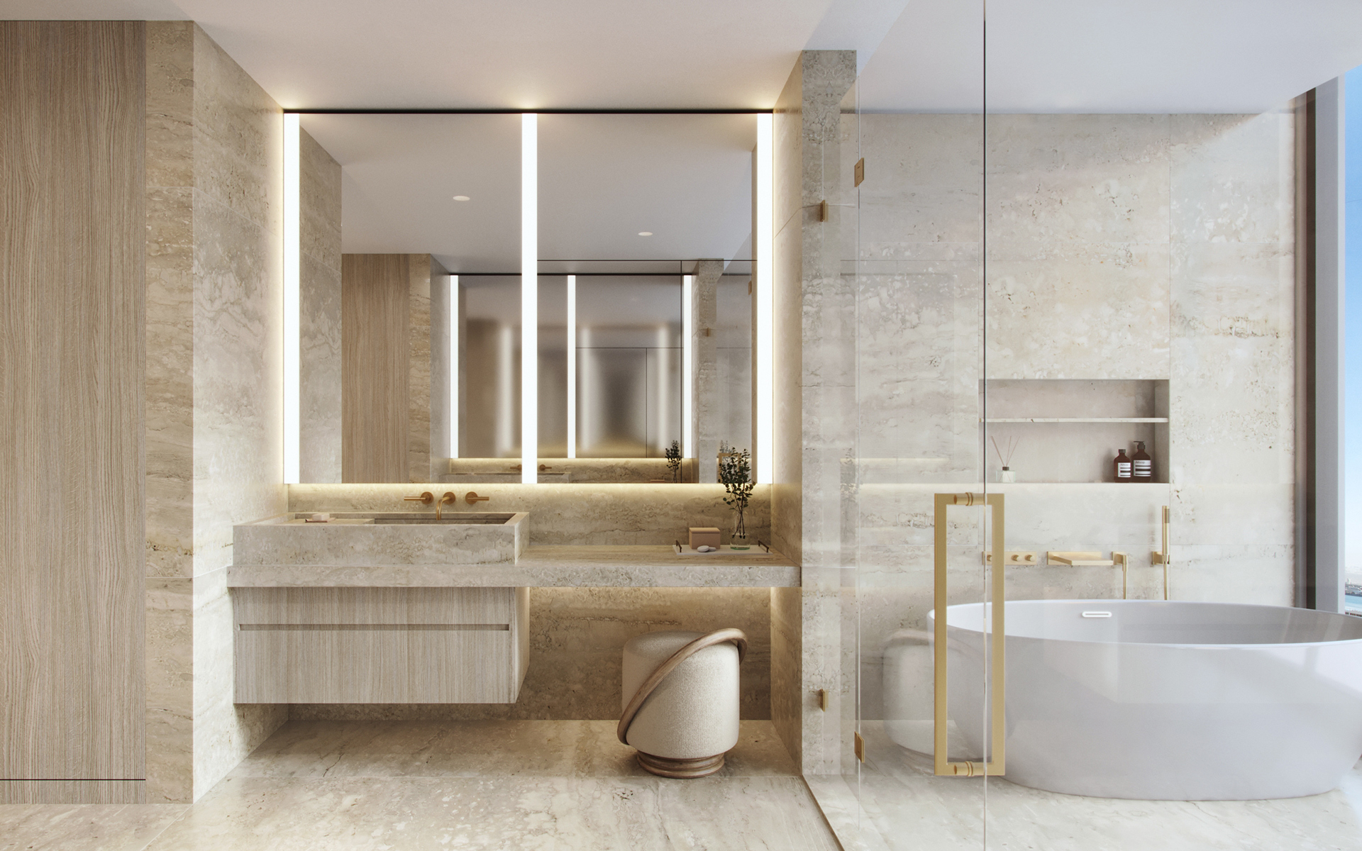 The 48-story East Tower comprises 149 high-end residences including the sought-after penthouses and sky villas; a collection of two-to-seven bedroom homes. Each unit space is indeed generous, ranging from 2,300 to well over 8,000 square feet with as much as eleven feet of ceiling space. Throughout every home, exquisite custom European marble flooring, European solid wood doorways, Italian cabinetry with matching marble countertops, and Dornbacht fixtures are fitted. These are simple yet elegant choices to make residents feel at ease upon arriving. Naturally, being situated along the South Brickell coastline guarantees unparalleled views of Biscayne Bay, Atlantic Ocean and the city, day or night.